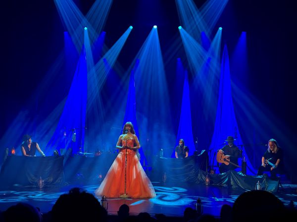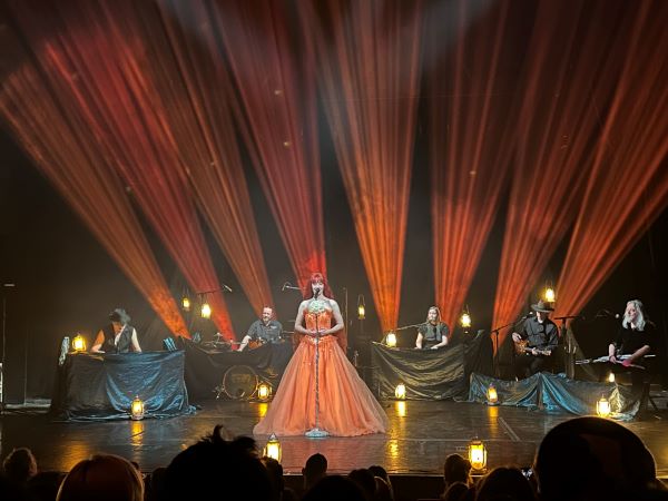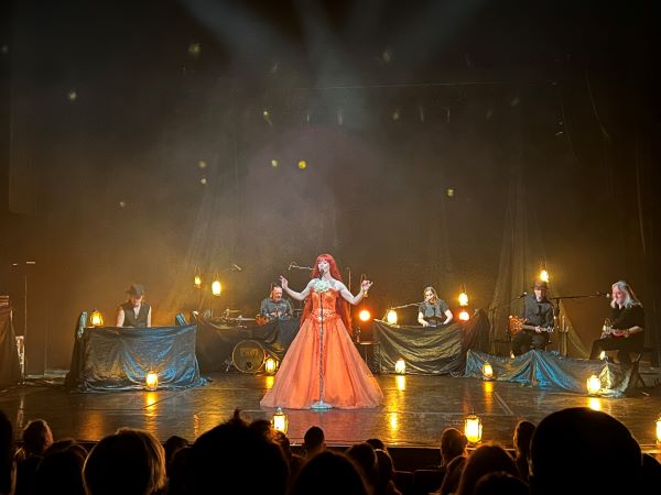 Večer s podtitulem „A Trail of Candles & Beginnings“ byl bez předkapely a patřil čistě finsko-britskému trojlístku Kurkela-Holopainen-Donockley doplněnému o hosty v podobě Johanny Iivanainen (klávesy, zpěv a úsměv) a Mikko Iivanainen (kytary, klobouk a zasmušilý výraz) plus zmíněného Hahta. Žádná předkapela ani speciální host, pozornost plně soustředěna na temný melancholický progresivní folk hlavních interpretů. Prostor byl pro tenhle typ hudby zvolen dobře. Pomalejší přemítavější a monotónnější muzika se lépe poslouchá v sedě a Hibernie přináší dávku intimity, která je k tomu třeba. Světelné i prostorové možnosti Hibernie byly využity funkčně a citlivě. Holopainen je perfekcionista a tomu odpovídala i příprava tour. Muzikanti jsou usazeni do půlkruhu jakoby okolo táborového ohně s Kurkelou uprostřed a zpěvačka s ofinou a bohatými rudými vlasy až pod zadek byla i ústřední hvězdou vystoupení. Jako frontwoman jednoznačně obstála. Johanna Kurkela je naživo stejně tak fascinující a přesvědčivou vokalistkou jako na studiových nahrávkách. Je protipólem nightwishovské Floor Jansen. Ne epická dračice a vikingská královna s majestátným hlasem, ale víla, lesní divoženka, která tká své melodie na zlatém kolovratu nad lesní tůní za půlnočního svitu měsíce. Nemá jen vynikající výraz a techniku, ale její hlas je jeden z těch, který poznáte po několika tónech. Ten hlas, který dokáže dokonale vyjádřit jakoukoliv emoci a kterému vše věříte – radost i smutek, rozervanost i spokojenost. Zpěvačka začala koncert úplně sama tichou a šeptavou „Those We Don´t Speak Of“ a teprve po ní se začali vynořovat ostatní hudebníci. Jestli je vedle samotné hudby tohle těleso něčím zajímavé, tak je to právě Kurkela. Vedle zpěvu ukázala, že je také schopna celý koncert prakticky sama táhnout, aniž by se lidé nudili.