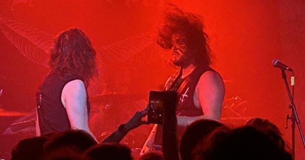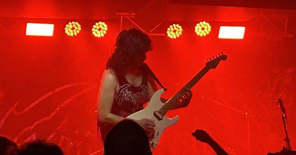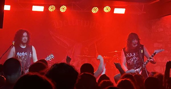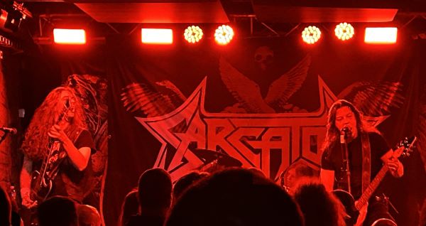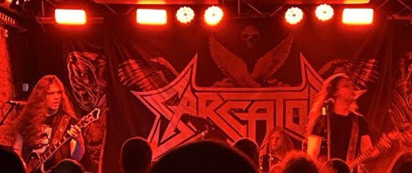 Jako první byli na řadě Švédové SARCATOR. Pětadvacátníci se pohybují na scéně od roku 2018, mají za sebou dvě EP a tři desky, z nich poslední vydali loni pod názvem „Swarming Angels And Flies“. Čtveřice disponuje opravdovým thrashovým lookem v podobě hubenosti, vytáhlosti a dlouhých čerstvě umytých vlasů, které elegantně a synchronizovaně během své produkce provětrávají. V jednom případě se kučeravost kštice blížila až mustaineovské dokonalosti. Vizualita ale v tomhle případě vítězila nad samotnou hudbou, která jede dost přímočaře old school a místy i trochu do punku, ale jen zřídka s nějakým výraznějším riffem. Kluci to ale kompenzovali energickým nasazením a pobíháním, což na konci vyústilo i v poměrně ostrý moshpit pod pódiem. Jinak ale nic, co by nutilo k opakovanému poslechu. Návštěvnictvo v zaplněném klubu, čítající odhadem tři sta kusů, nicméně projevovalo patřičné nadšení.