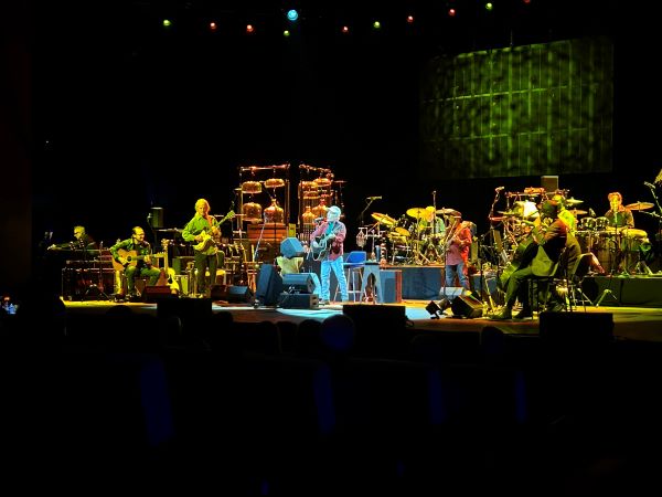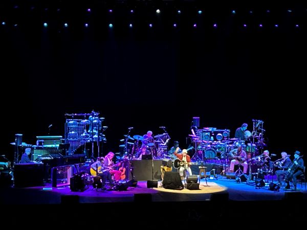 Zpěvák si tentokrát nepřivezl tak velkou kapelu jako před deseti lety. Právě kvůli potížím se sluchem volí na své poměry menší sály i komornější setup, který mu pomáhá se (i s pomocí naslouchátka) na pódiu zvukově lépe orientovat. I tak jsme se se dočkali dalších dvou kytar, piana, bicích, perkusí, basy, flétny, violy, cella a v jednu chvíli i saxofonu. Vizuálně vůbec největší pozornost nicméně na pódiu zaujímala konstrukce zvaná Cloud Chamber Bowls, což je sestava asi dvanácti visících odříznutých části skleněných demižónů, které vydávají zvuk připomínající něco mezi zvonkohrou, marimbou a tibetskou mísou. Muzikanty má principál každopádně hvězdné a známé zejména z jazzového a world music okruhu. Za bicí zasedl veterán Steve Gadd, který je mimochodem autorem onoho bubenického „riffu“ na začátku slavné skladby „50 Ways to Leave Your Lover“. Perkuse ovládal Jamey Haddad a basu proháněl Bakithi Kumalo, který je posledním zůstavším členem Simonovy kapely z jihoafrického ansámblu, s nímž nahrál svou nejúspěšnější sólovou desku „Graceland“ (1986). Čas od času na pódium zavítala i Edie Brickell, písničkářka a od roku 1992 i Simonova manželka, se kterou má tři děti.