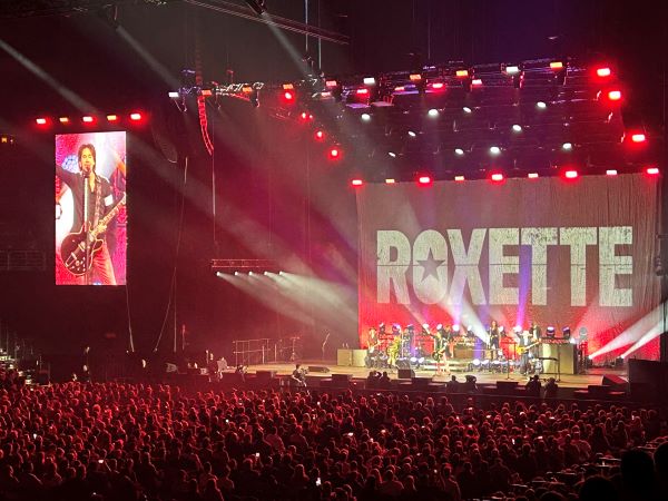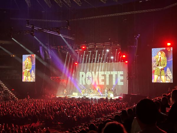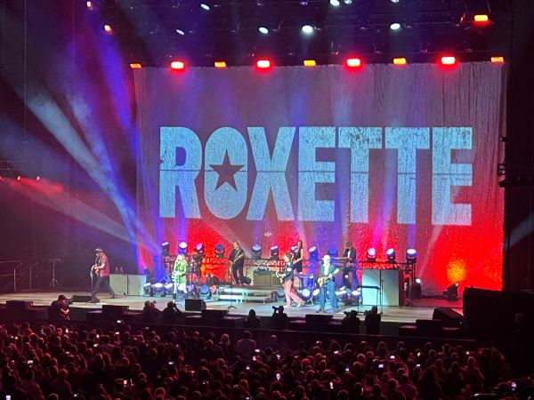 Úderem deváté se za jevištěm objevil nápis Roxette, kapela neformálně nakráčela na pódium a spustila „The Big L.“, jeden ze singlů z alba Joyride a jedna z těch rychlých rockových věcí, které dobře šlapou. Obava, že to nebude fungovat, padá, stejně jako nostalgické brýle. V hale se prostě hraje dobrá a živelná muzika, není nad čím bádat. Per Gessle vypadá zdálky stejně jako v roce 1990 (asi si barví vlasy) a Lena Philipsson zpívá spolehlivě. Doprovodní muzikanti se sice – jak Per připomene při představovačce – skládají dost často z lidí, kteří jsou s ROXETTE už od začátku, ale já je vidím poprvé v životě. Prostě další dvě kytary, basa bicí, klávesy a doprovodná zpěvačka. Show veskrze žádná, nějaká ta instantní světla a vzadu se během večera vedle loga vystřídá pár dalších obrázků (proč tam byla slůňata?). Je to o muzice…